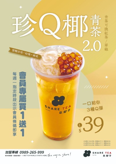 就是要喝純茶尬滿滿配料!人氣手搖飲品牌「Share tea 歇腳亭」驚喜推出升級版「珍Q椰青茶2.0」,一杯就能狂咬黑糖珍珠、手工粉條加荔枝椰果3種配料,飽足感十足,更加碼祭出周一限定「買1送1」優惠,當天限時3小時搶喝,趕緊先筆記。原文網址: 快筆記!每周一限時3小時搶喝「珍Q椰青茶買1送1」 | ETtoday旅遊新聞 | ETtoday新聞雲 https://3333ku.net/html/news/20220524/2257817.htm#ixzz7UG6QTfC6Follow us: @ETtodaynet on Twitter | ETtoday on Facebook