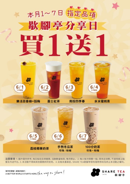 SHARE TEA歇腳亭慶端午,連續五天指訂飲品買一送一 迎接端午節三天連續假期,知名手搖飲SHARE TEA歇腳亭全台門市連續五天同步推出「指定飲品買一送一」好康優惠活動。端午連假三天買一送一品項為:6/3(五)南投四季春原價30元,6/4(六)水水蜜桃青原價40元,6/5(日)荔枝椰果奶茶原價50元,6/6(一)手熬冬瓜茶+珍珠/粉條原價45元,6/7(二)100分奶茶(珍珠+粉條)-北部原價55元、南部原價50元。 Read More