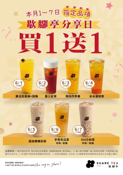 歇腳亭每天買1送1都不同!50嵐「四季春珍波椰」也買1送1 端午優惠喝不完!炎熱的連假原地過節,就是要在家大口喝手搖飲耍廢。餐飲業者爭相推出端午促銷,歇腳亭宣布全台門市一連六天指定飲品買一送一,且每天品項都不同,讓民眾喝好喝滿。Uber Eats也持續發動外送買一送一,10大人氣手搖飲通通喝起來。 Read More