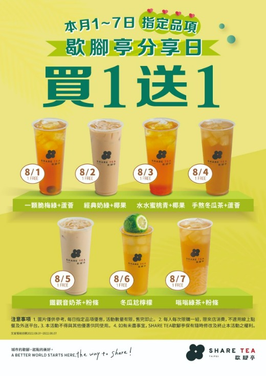 TVBS新聞網-手搖控快衝!歇腳亭今起「分享週」 天天買一送一 炎熱夏日不少人都喜歡來杯手搖飲,不少業者也推出優惠活動,SHARE TEA歇腳亭八月1日到7日天天推出買一送一優惠,平均一杯最低只要23元。 Read More