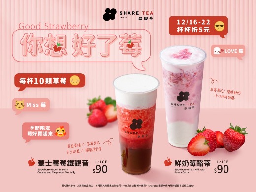 Sharetea歇腳亭於12/16將推出「你想好了莓」系列,兩款飲品「每一杯裡都有10顆草莓」的份量,「鮮奶莓酪蒂」以手工奶酪加入每日新鮮製作的草莓鮮果泥,再注入香醇鮮奶,呈現粉白交織;「蓋士莓莓鐵觀音」現打芝士鹹奶蓋,中段有新鮮草莓果泥,再以黃金翠綠為基底,再加上Sharetea歇腳亭特製的鐵觀音茶凍,吃得到酸甜果肉香和滑Q茶香凍,口感層次超豐富。陪草莓控喝滿整個冬天,將於12/16-12/22上市首週「杯杯折5元」!