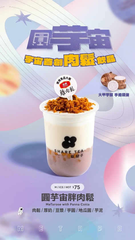 全台首創肉鬆飲品—圓芋宙胖肉鬆 Sharetea歇腳亭首杯鹹飲品,一口吸足五種口感 “肉鬆” 在國民心中總占據著不可動搖的地位。 無論是在白米粥、烤吐司或飯糰, 我們對它再熟悉不過!! 面對如此受衆人喜愛的 “餐桌寵兒” 我們一直小心翼翼的調整再測試, 更加嚴苛的確保每一種食材入口後的風味和尾韻留下的層次感。 直到它真的在飲品中綻放光彩!! 大家會買單嗎? 我們有信心! 歷經幾十次的比例調整,給您一口上癮的全新口感! Read More