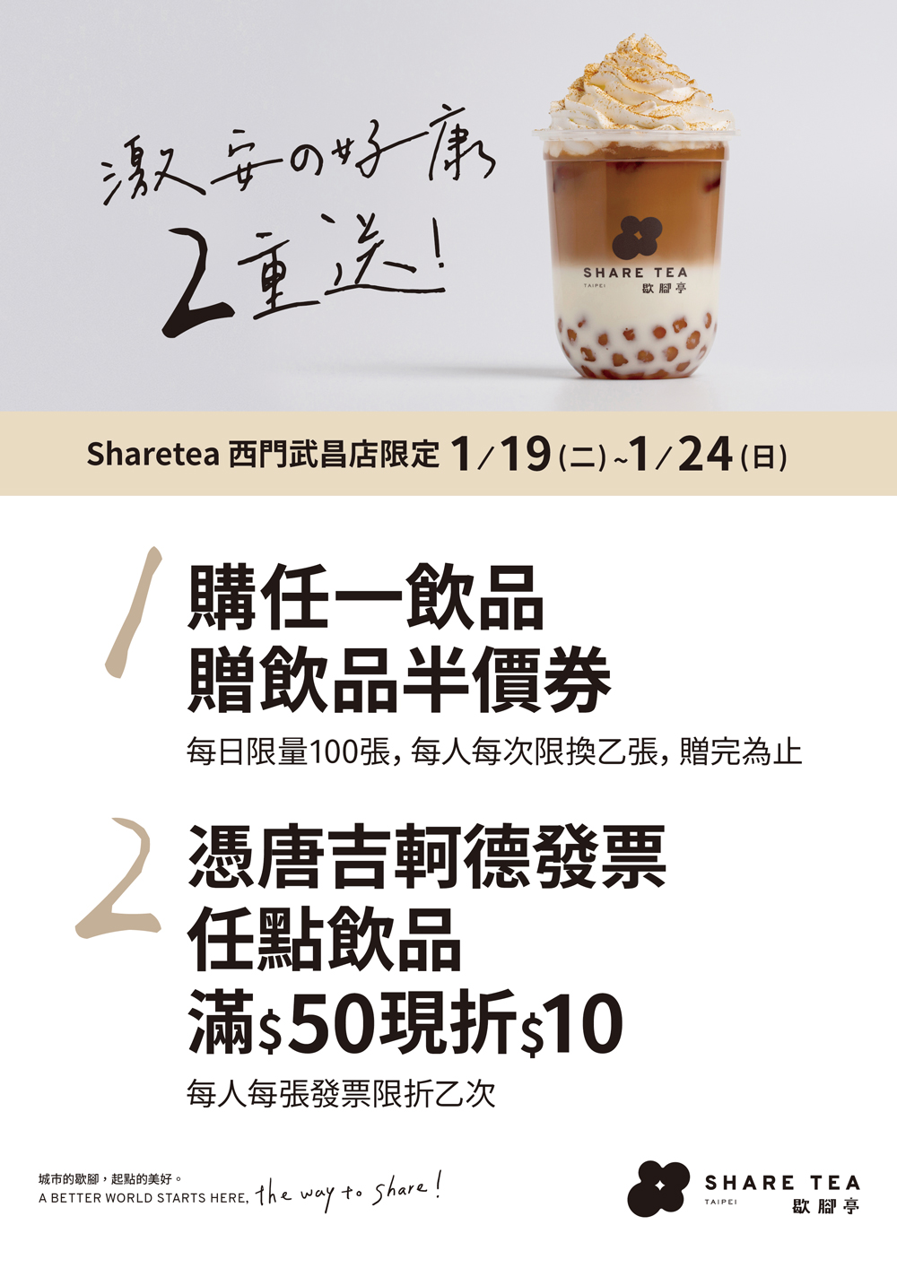 歡迎”唐吉訶德”當鄰居「SHARE TEA歇腳亭」西門武昌店 1/19-1/24激安の好康二重送! 讓哈日族引頸期盼已久的「唐吉訶德」台灣1號店「Don Don Donki」終於要在1/19(二)於西門町正式開幕,而位於一樓的「SHARE TEA歇腳亭」西門武昌店也為了歡迎這位日本來的新鄰居,並期待能為西門町帶來人潮,1/19-1/24這六天推出”激安好康二重送”一起慶祝! 西門武昌店 電話:(02)2314-1616 地址:台北市萬華區武昌街二段60號