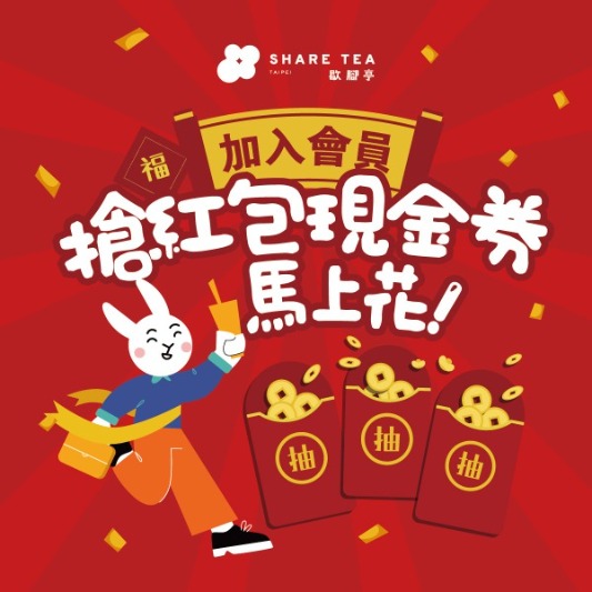 2023/1/14前,加入SHARE TEA官方LINE帳號(@lianfa1992),每位會員可以獲得新春紅包抽獎,最高可領取 SHARE TEA 100 元飲品抵用券!