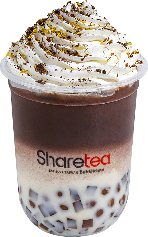可可與鮮奶融合成香醇風味,裡面的黑糖蜜釀珍珠與琥珀咖啡凍吃起來超搭,頂端的OREO碎片的香甜與黃金桂花辦的清香則增加嗅覺的豐富度,細緻香緹讓口感變得更為滑順。