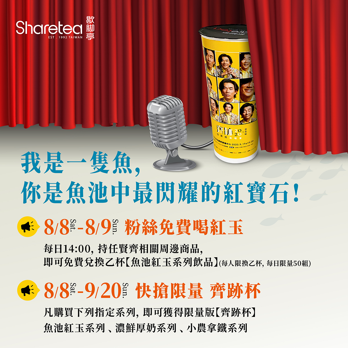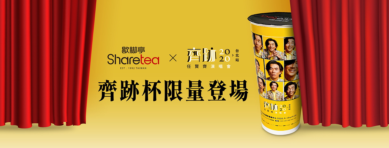 出道30年的亞洲天王任賢齊,在歌迷的引頸期盼之下,即將於9/19-20回歸TICC台北國際會議中心,舉辦大型演唱會「齊跡2020演唱會台北場」。任賢齊透露這場演唱會將復刻1998年第一場個唱,預計將會是滿滿經典的回憶殺、讓歌迷大飽耳福。知名手搖飲品牌Sharetea歇脚亭為共襄盛舉,特別推出10,000杯有著齊跡演唱會宣傳的九宮格任賢齊肖像的”齊跡杯”,搭配三款指定飲品,於8/8至9/20在台北三間直營門市開賣,讓喜歡任賢齊的歌迷能”握在手裡”,喝完後杯子還能留下當作紀念。